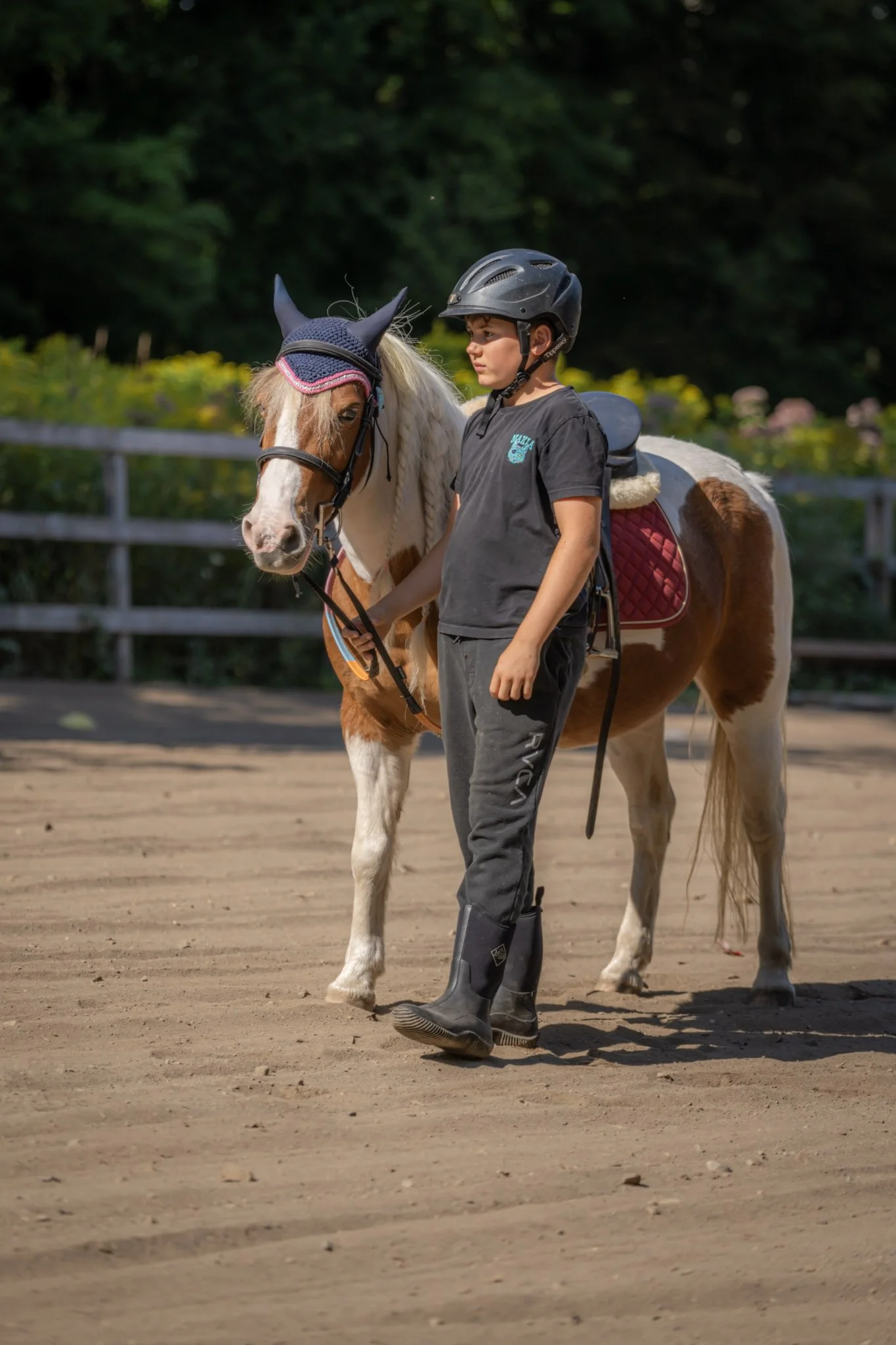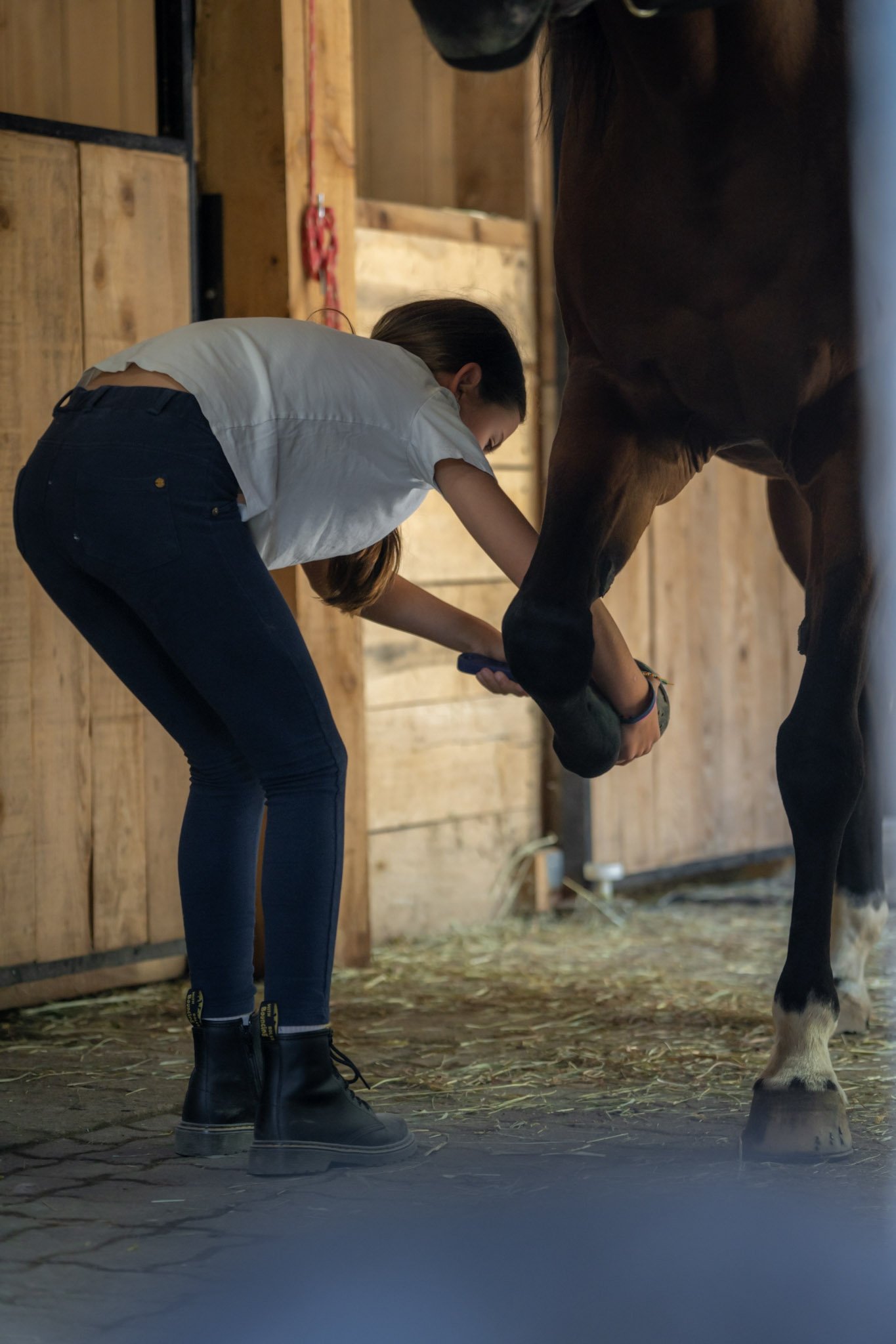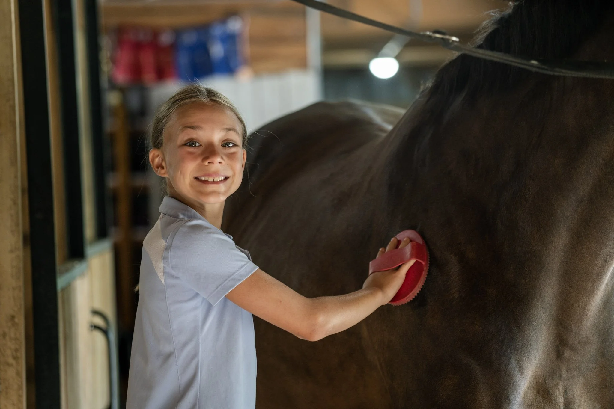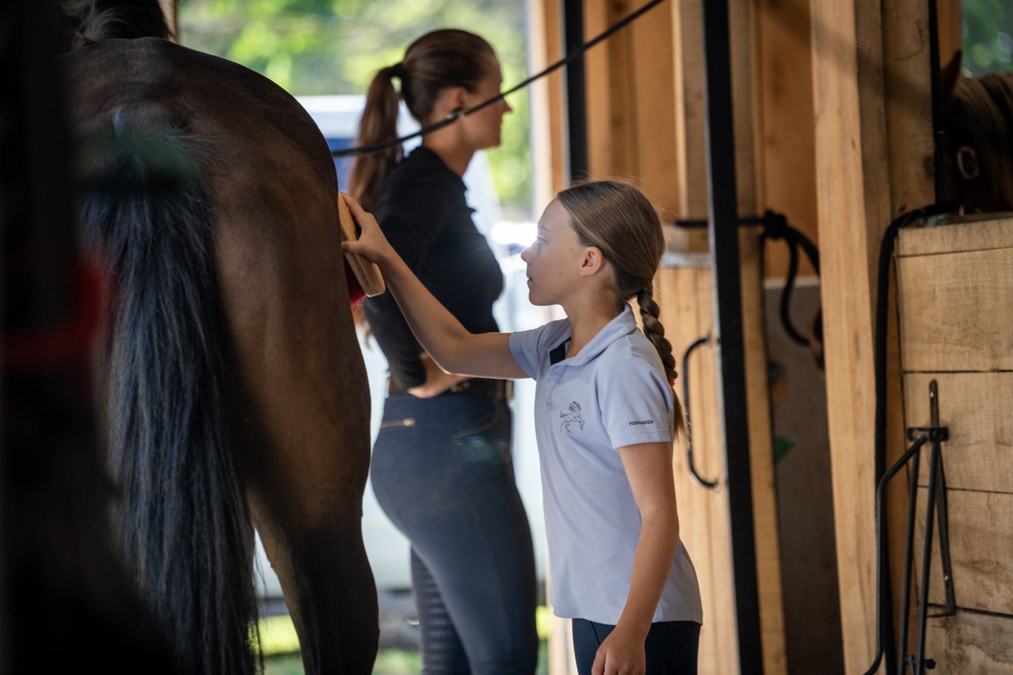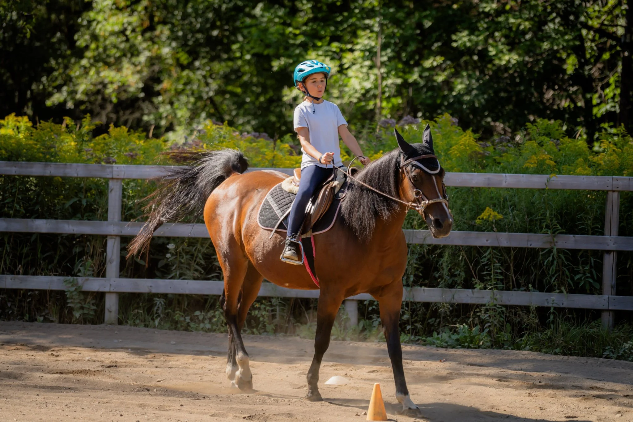 Que tu connaisses déjà les chevaux ou non, nous apprenons comment s’en occuper au quotidien, les brosser et les monter.